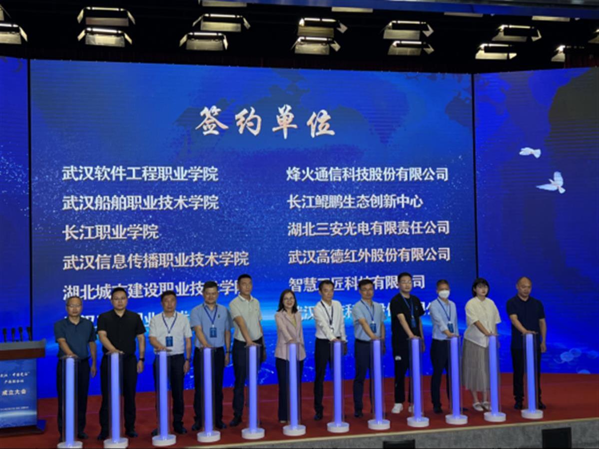 5月19日,“武汉·中国光谷”产教联合体成立仪式在烽火通信科技股份有限公司举行。湖北省委教育工委专职副书记、省教育厅党组成员张幸平,武汉市人民政府副秘书长张明武、武汉东湖新技术开发区党工委副书记王晓林,烽火通信科技股份有限公司董事长曾军、武汉软件工程职业学院党委书记马蜂等领导嘉宾出席大会。湖北城市建设职业技术学院副校长易操代表学校应邀出席大会,并连同校企合作单位智慧工匠科技有限公司参加联合培养现场工程师签约仪式。大会审议并表决通过了产教联合体章程、理事会理事单位、常务理事单位、副理事长单位、常务副理事长单位、理事长单位名单,湖北建院荣获“武汉·中国光谷”产教联合体理事会副理事长单位。